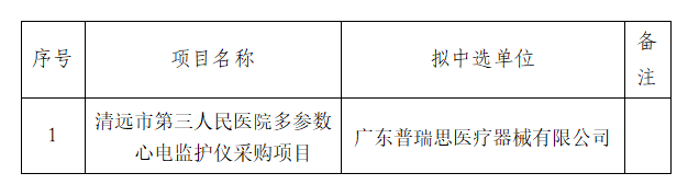 现公示清远市第三人民医院多参数心电监护仪采购项目中选结果,具体信息如下:
